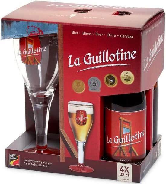 Превосходный крепкий бельгийский эль "La Guillotine", выпущенный в 1989 году к 200-летию Французской Революции, — очень популярный напиток во многих странах мира. Пиво производится путем вторичного дображивания в бутылке. Благодаря использованию в составе пива трех сортов хмеля — Saaz, Brewers Gold и Amarillo, напиток имеет изысканный ароматный букет с нотками трав и цитрусовых и сложный вкус с заметной хмелевой горчинкой.