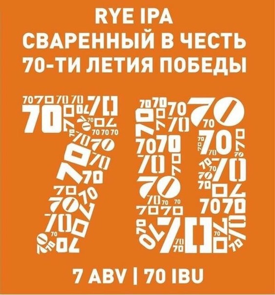Сварили этот праздничный сорт в честь 70-ой годовщины Победы в Великой Отечественной Войне. «70» – это дань памяти солдатам, принесшим на землю мир. «70» – это благодарность за чистое небо над нашими головами. Победоносное пиво сварено в стиле IPA. Для придания полноты вкуса и тела добавили немного ржаного солода. Для охмеления были выбраны одни из лучших американских хмелей – Magnum, Citra и Cascade. Освежающий эль с нотками сосны, можжевельника и цитрусов отлично скрасит ваш вечер. А накатывающая горечь хмеля и грейпфрутов не оставит вас равнодушными. Black Cat Brewery – команда энтузиастов-любителей пива из России и США, полных решимости производить и поставлять качественное крафтовое пиво в Россию.