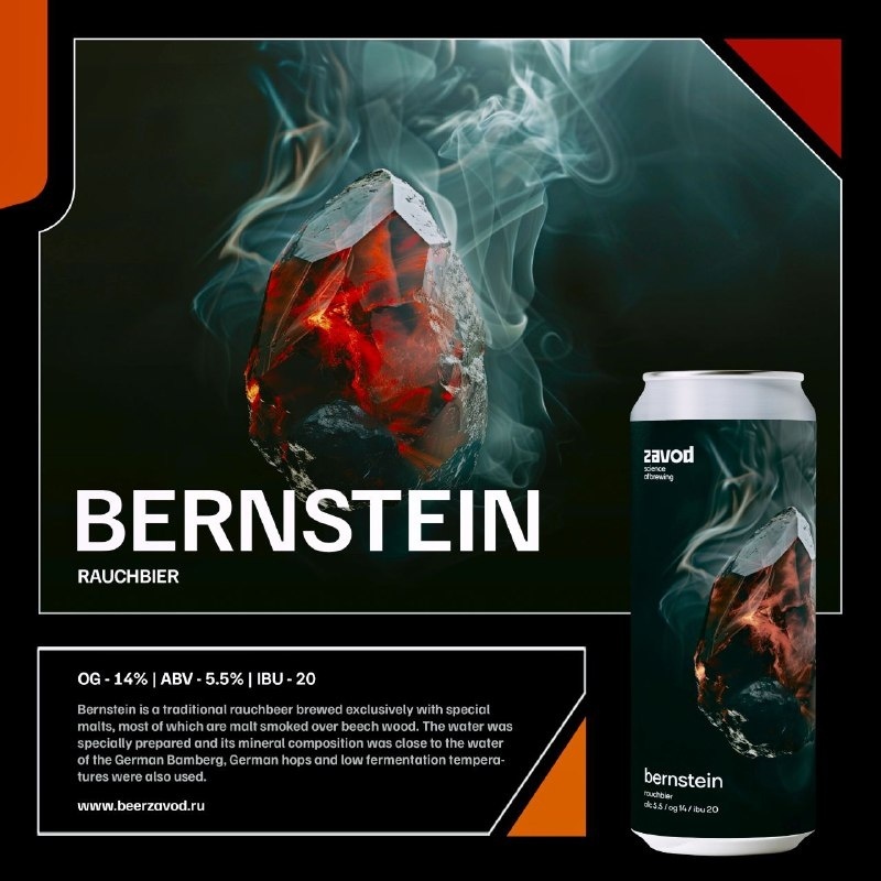 Встречайте дымную новинку! Bernstein - традиционный раухбир, сваренный исключительно на специальных солодах, большую часть которых составляет солод копченый над древесиной бука. Вода была специально подготовлена, приближена минеральным составом к воде германского Бамберга, использовался также немецкий хмель и низкие температуры брожения. Пара кружечек этого легкого нефильтрованного пива - самодостаточна, однако будет и отличным дополнением к ужину в стиле немецкой кухни или к мясным блюдам хлебосольных баварских кнайпе!