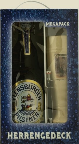 Подарочный набор в картонной коробке — бутылка пива ФЛЕНСБУРГЕР ПИЛС, глиняная кружка и шариковая ручка.