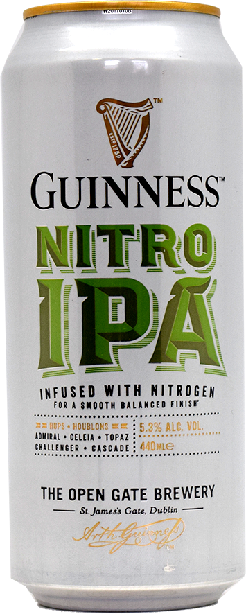 Guinness Nitro IPA — индийский бледный эль от пивоварни St. James's Gate (Diageo), Дублин, Ирландия. Варится с хмелями Cascade, Admiral, Celeia, Topaz и Challenger. Также при изготовлении пива используется фирменный штамм дрожжей Guinness. Сбалансированный напиток с богатым, гармоничным вкусом и приятным ароматом.Цвет янтарно-медовый. Пена кремово-белая. Аромат карамельный, островатый, цитрусовый, солодовый, сенной, травянистый, хмелевой, пыльный, землистый. Ноты ирисок, чая. Вкус сладковатый с горчинкой, хлебный, солодовый, сосновый, фруктовый, хмелевой, маслянистый. Послевкусие с горчинкой.