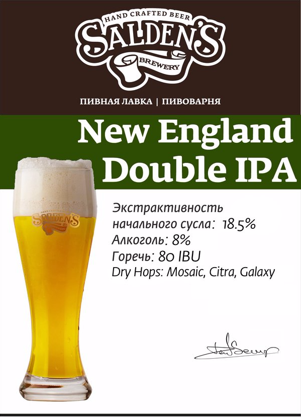 New England IPA — достаточно свежий стиль, который уже успел стать модным у нас в России. Главные отличия от стандартной IPA, — это более мягкая горечь и яркая цветность. Цвет — желтоватый, мутноватый, полупрозрачный. Запах сладких фруктов. Насыщенный вкус,плотный,тягучий.В финале привкус цедры.