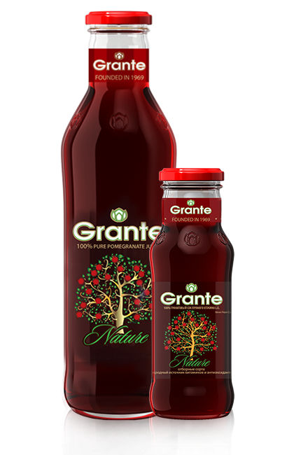 Неосветленный 100% гранатовый сок Nature по праву считается нашей гордостью. Технология прямого отжима, отсутствие дополнительной фильтрации и щадящая пастеризация делает этот сок максимально полезным по содержанию витаминов и микроэлементов. В дополнение к особым вкусовым характеристикам, сок имеет непревзойдённый глубокий терпкий вкус настоящего свежевыжатого граната. Сок содержит повышенное количество антиоксидантов, витамина С, витаминов В6 и В12. Ежедневное употребление гранатового сока Grante Nature поможет сохранить ваше здоровье, молодость и красоту.