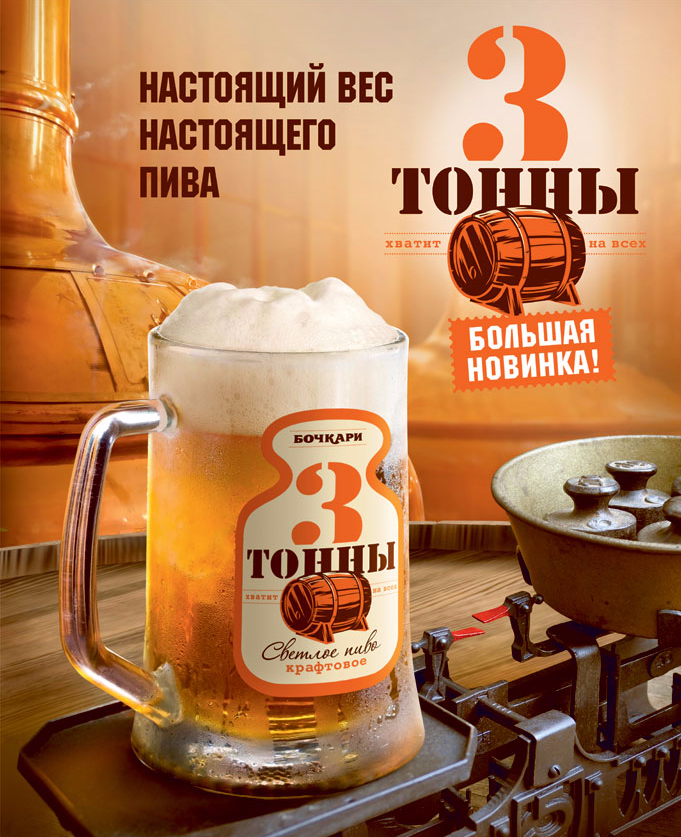 Пиво «Три тонны» отличается особо мягким вкусом, светлым золотистым цветом, искрится и играет легкими нежными пузырьками. В рецептуру сорта «Три тонны» к светлому ячменному пивоваренному солоду добавлен специальный Мюнхенский солод - для придания пиву особого выразительного аромата и полноты вкуса. Оба солода отличаются отменным качеством, что позволяет готовить пивное сусло при более высокой температуре. Это дает пиву «Три тонны» высокую белую пену, полноту солодового вкуса, которая отлично сбалансирована хмелевой горчинкой, быстро уходящей на второй план. Пиво «Три тонны» бродит и дображивает по классической технологии в закрытых лагерных танках небольшого объема (танки – ёмкости для брожения пива). Отсюда и название сорта – «Три тонны». Главное брожение длится 7-10 дней. Окончательное созревание (этап дображивания) продолжается 21 день и более. В это время пиво «Три тонны» набирает «тело» и глубину вкуса с мягким солодовым характером, быстро проходящей хмелевой горчинкой и сладковато-сухим финалом.