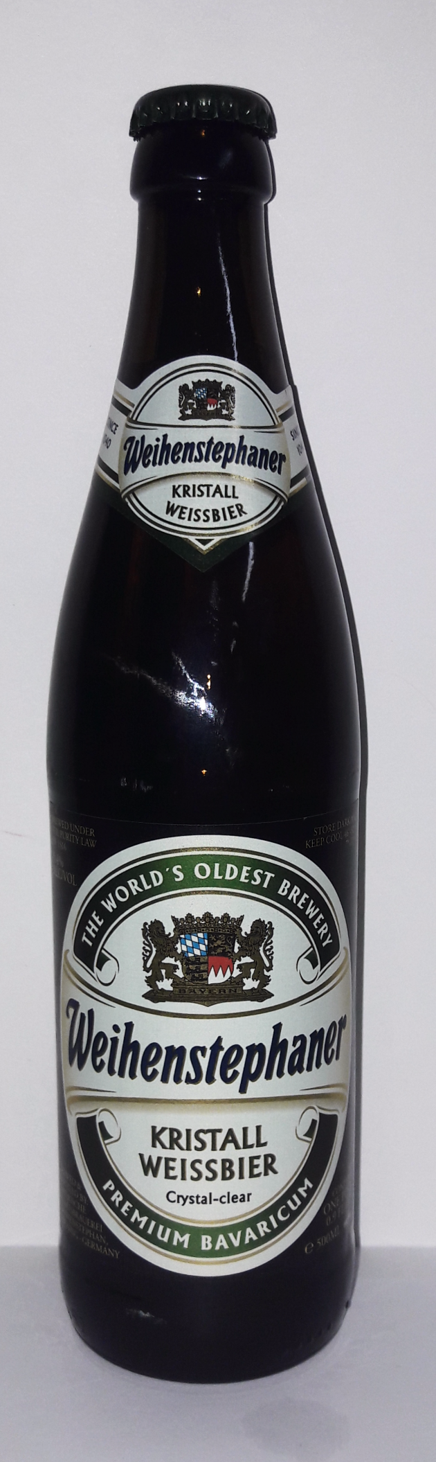 Светло-золотистый цвет с супер густой белой головой. Аромат:гвоздики, банана, дрожжей, сена. Вкус: дрожжей, гвоздики, дуба, горькой цедры и пшеницы. Жемчужный, шипучий вкус благодаря секрету брожения , который разработали специально для кристалльного пшеничного пива Weihenstephaner Kristall Weissbier.